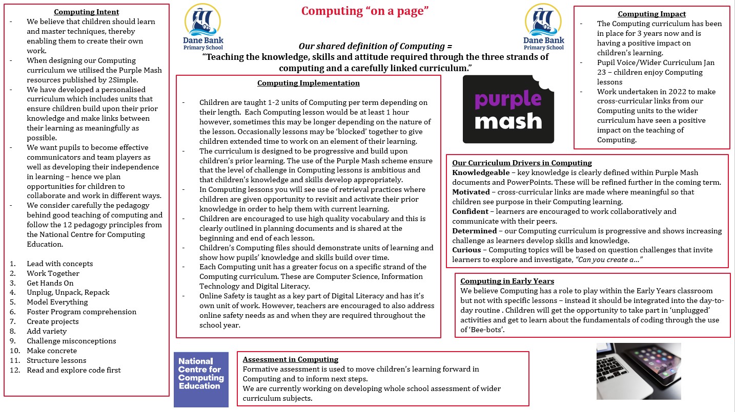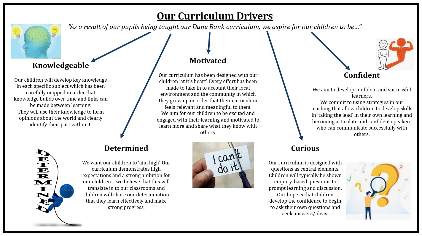 At Dane Bank Primary School we aim to provide a curriculum that is engaging, balanced and relevant to our learners. We passionately believe in developing the whole child, nurturing individual talents and fostering a love of learning and we work towards this through providing exciting and challenging learning opportunities in all curriculum areas.