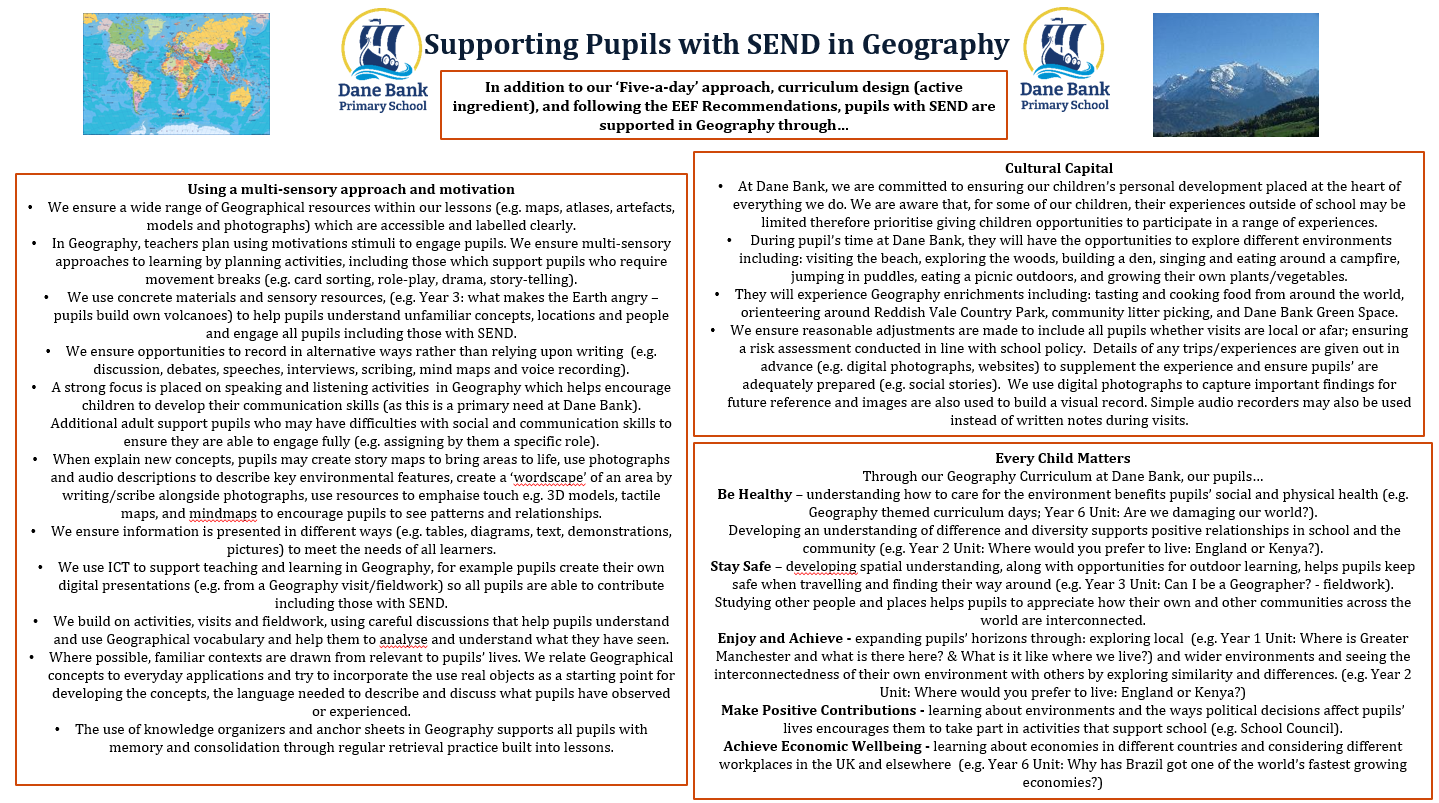 "Inclusion in..." documents demonstrate how we ensure all children are supported effectively across each curriculum area and how we ensure the needs of SEND learners are met.