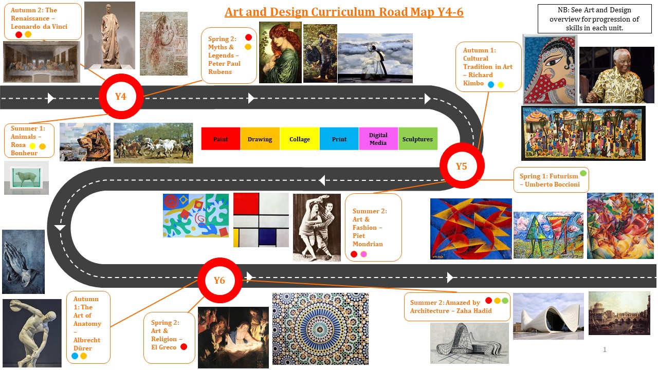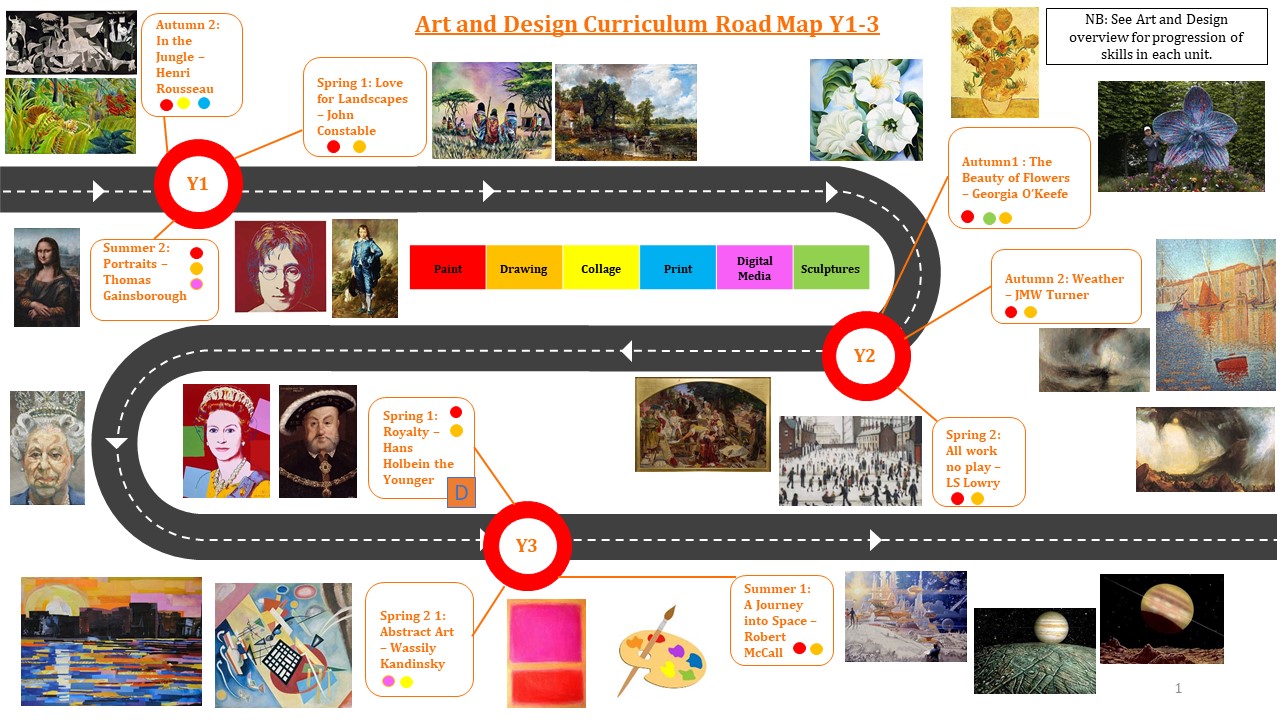 Where appropriate, Art and Design lessons link to other wider curriculum subjects. The Art and Design skills overview document outlines: the units of learning the children undertake each year; key threshold knowledge; the key skills that are developing and the progression between different milestones