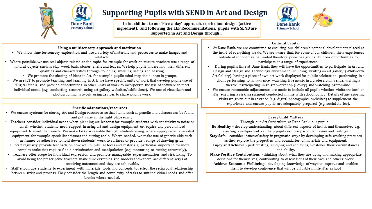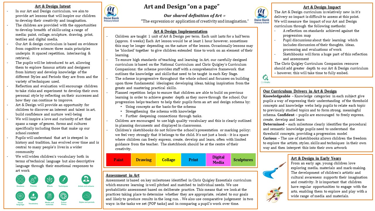 At Dane Bank Primary School, we believe that through art, craft and design we want to engage, inspire and challenge pupils by introducing them to a broad range of techniques, materials and artists, craftspeople and designers. We want to equip them with the knowledge and skills to experiment, explore, take risks, invent and create. It will enable them to be authentic and explore their own identity as well as being curious about respecting and connecting with others. Most importantly, we want them to foster a positive, life-long relationship with the subject and have fun.