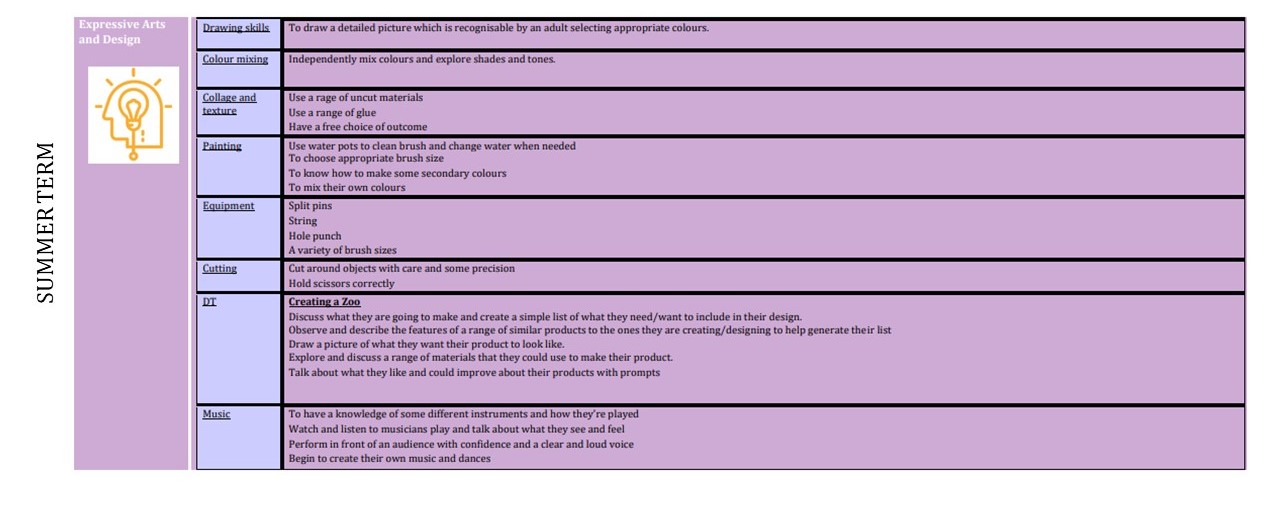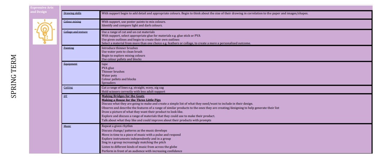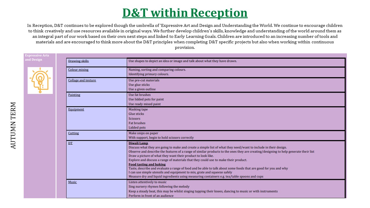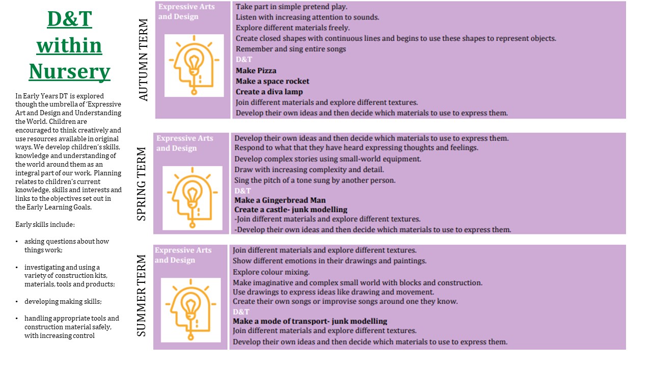 Our Early Years to Key Stage One "Bridging Documents" give an overview of how the Design Technology curriculum "bridges" from the end of Nursery and Reception in to Year One.