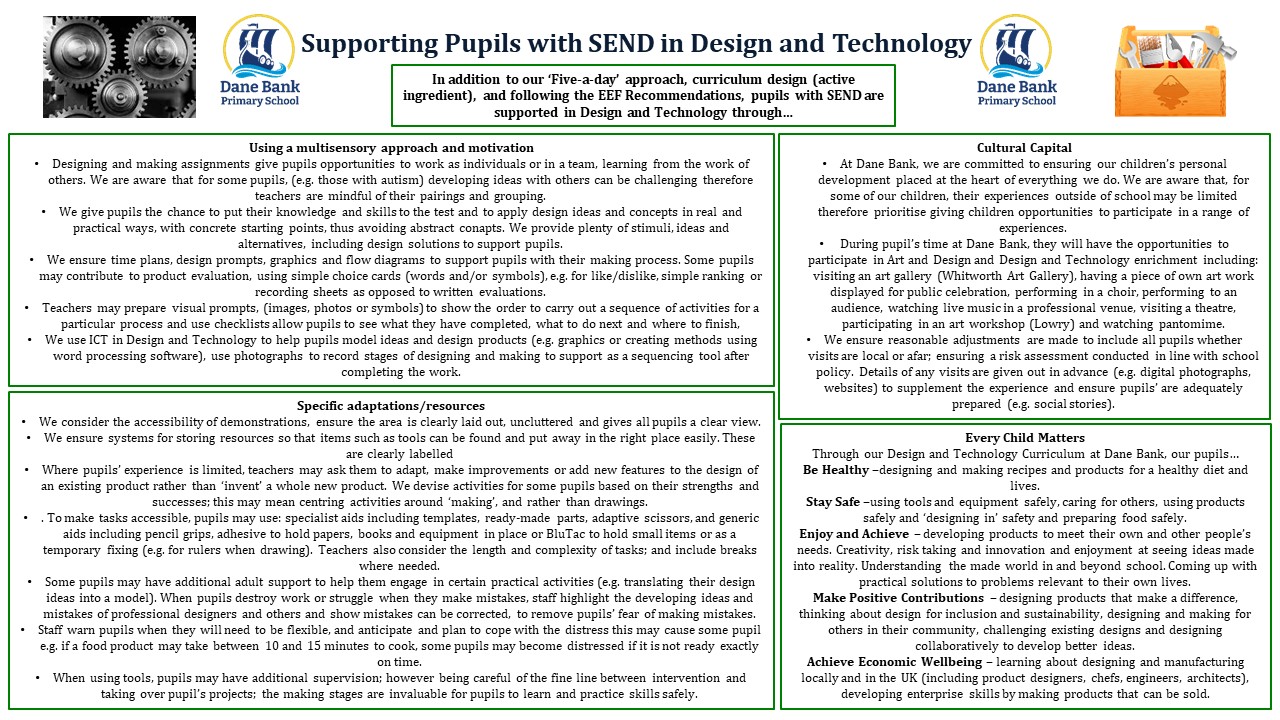 Design and Technology develops children’s skills and knowledge in design, structures, mechanisms, electrical control and a range of materials, including food. It encourages children’s creativity and encourages them to think about important issues.