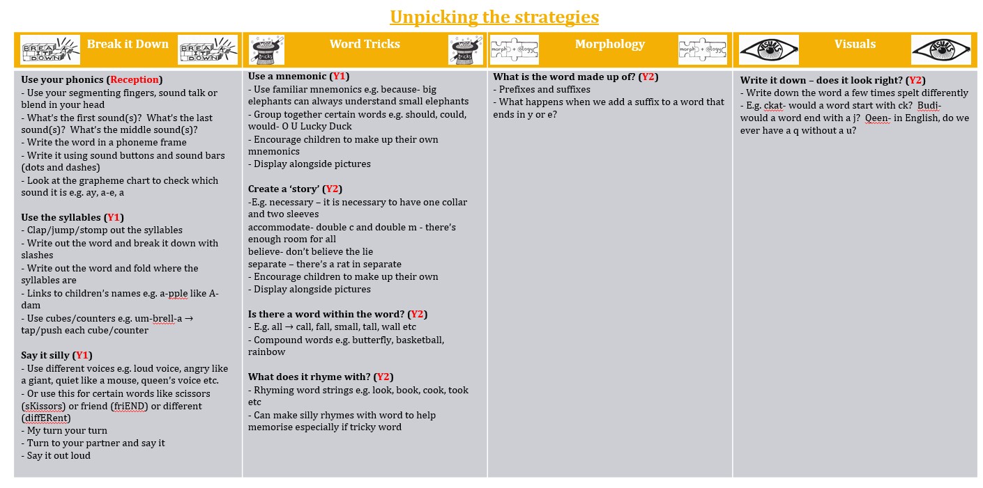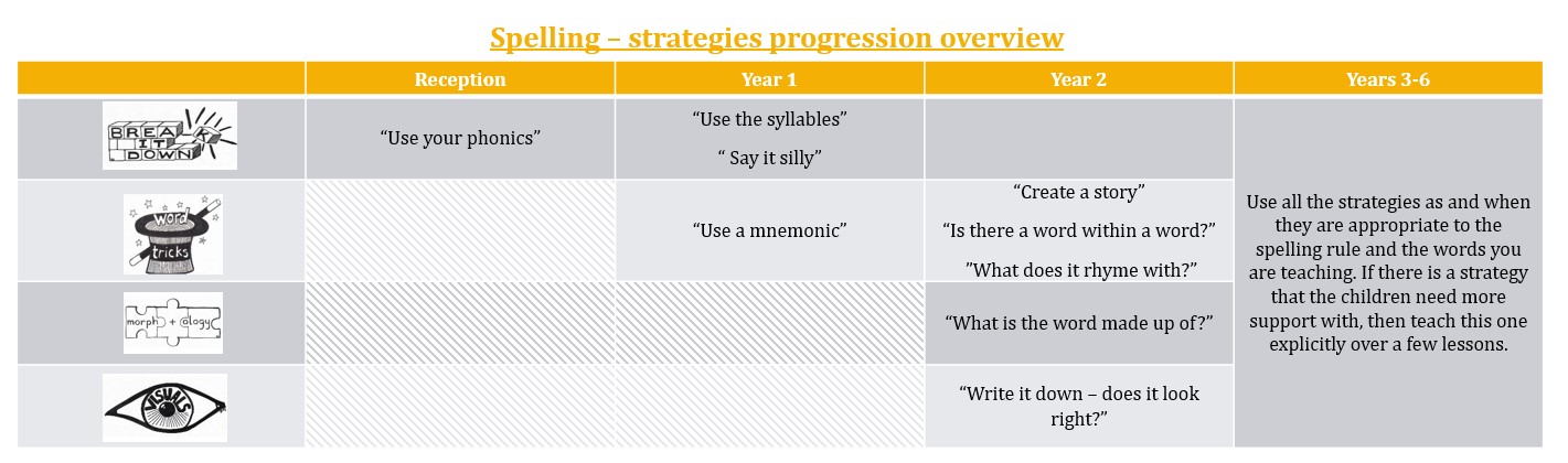 We have mapped these strategies from Reception up to Year 6 to show how and when they are introduced to children. the aim is that by the time the children reach Upper Key Stage Two, they are familiar with and confident to use all 4 strategies as tools to support their independent spelling.