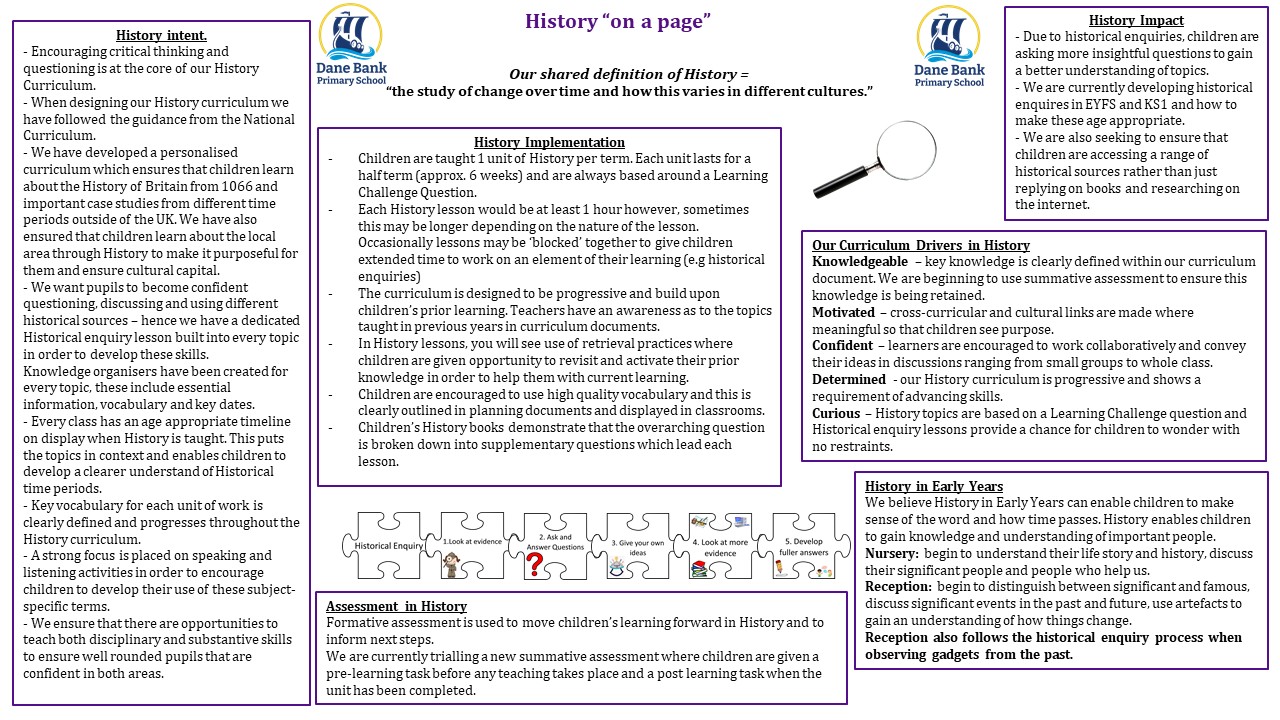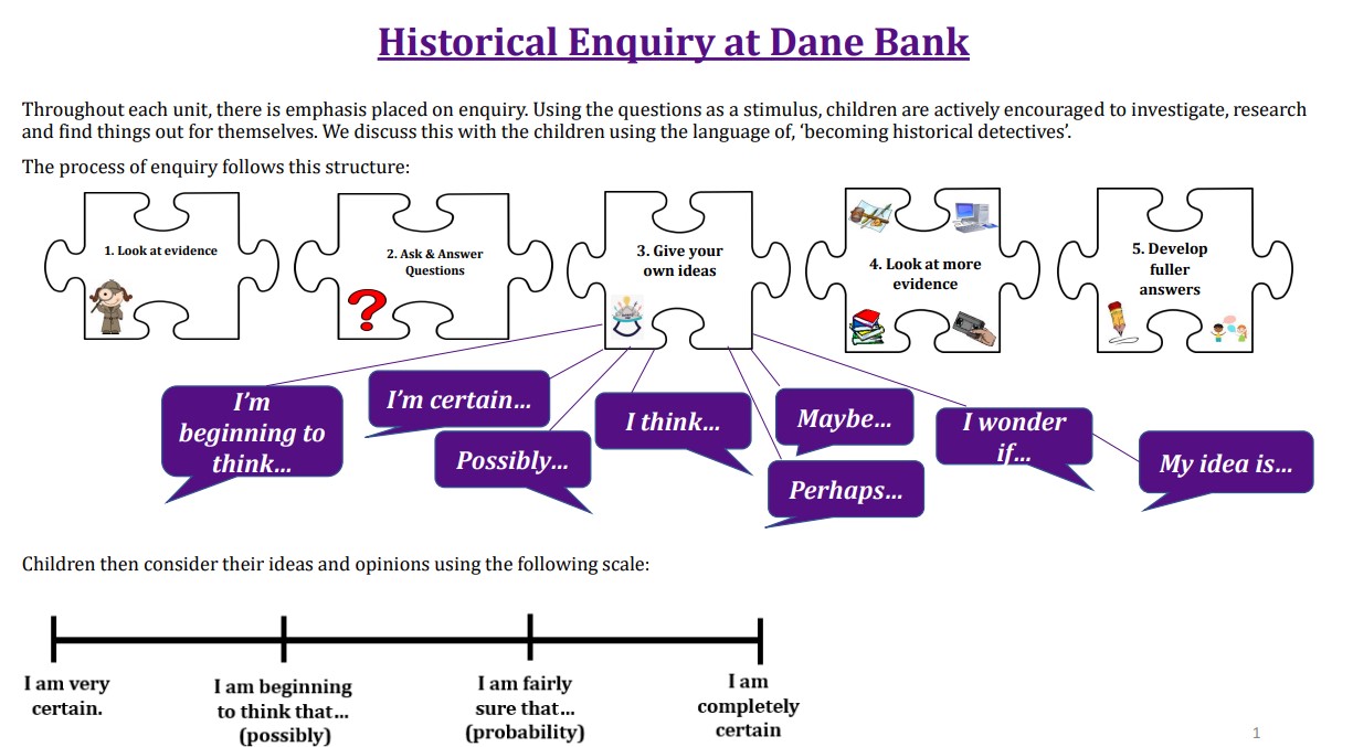 Throughout each unit, there is emphasis placed on enquiry. Using the questions as a stimulus, children are actively encouraged to investigate, research and find things out for themselves. We discuss this with the children using the language of, ‘becoming historical detectives’.