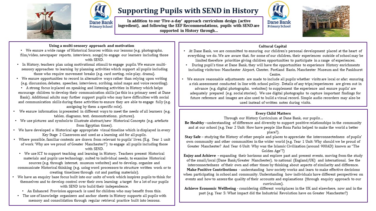 The History curriculum has been planned carefully based on key knowledge that children will learn during each unit. The curriculum map allows for progression as the units build on prior knowledge and aim to extend learning by acknowledging what children already know. Careful consideration is given to the school’s context and local area and the curriculum has been designed to link to this as far as possible. For example, History units linking to the Industrial Revolution in Greater Manchester and the work of the Manchester-based Suffragette movement. This should give children a sense of purpose with their learning and make the History and Geography curriculum relevant and relatable.