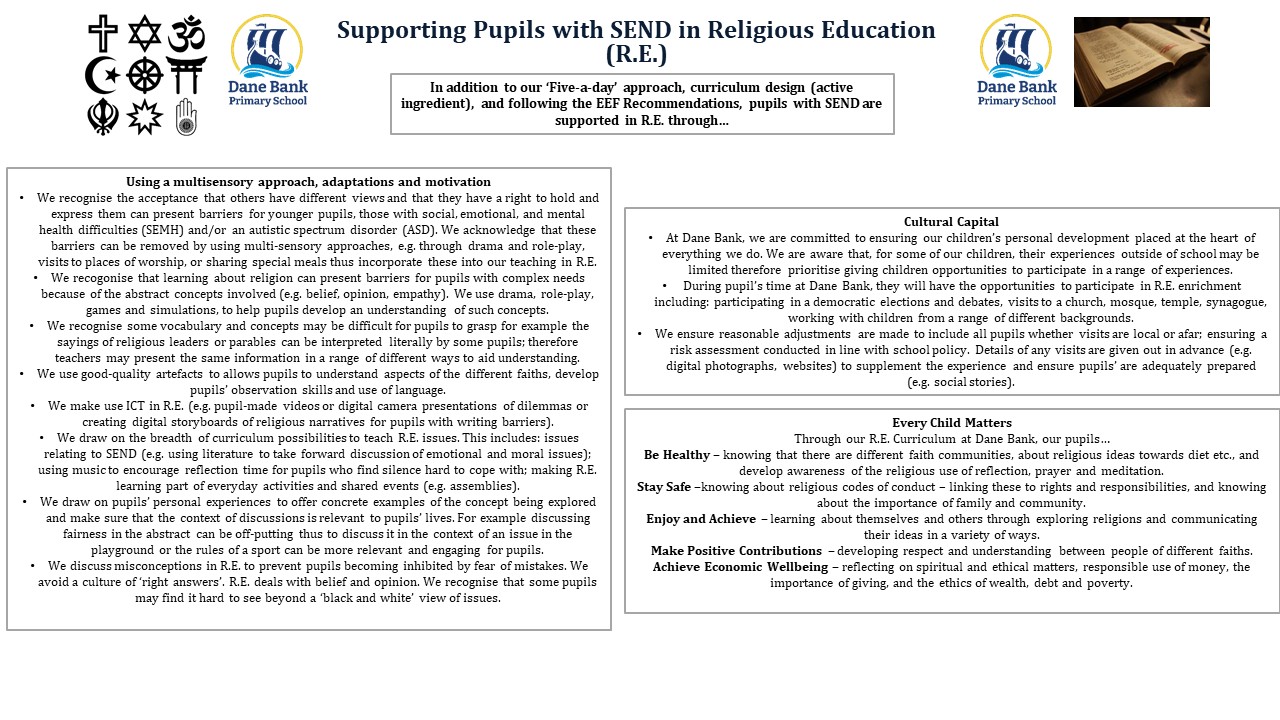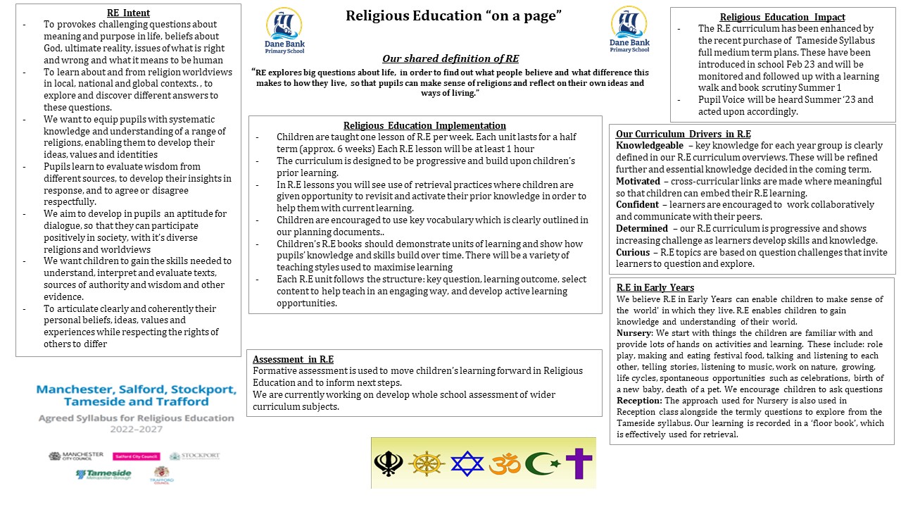 Our Religious Education curriculum is a bespoke curriculum developed using two main documents: The Focus Education RE Learning Challenge Curriculum and the Tameside Agreed Syllabus for Religious Education. We use these two documents to create a bespoke Religious Education curriculum that we feel meets the needs of our pupils and focuses on the most relevant issues and concepts fort them.